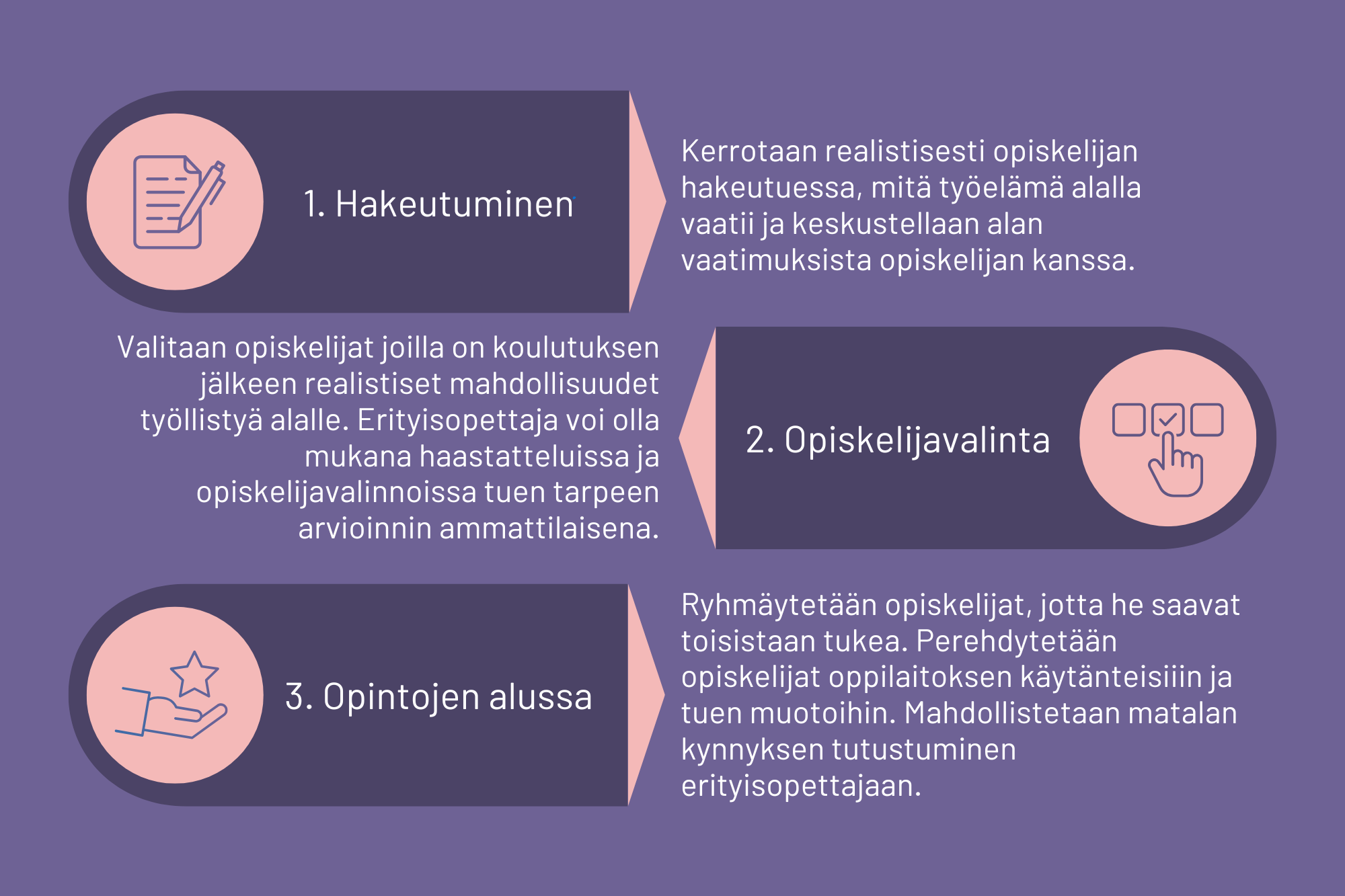Opiskelijavalinnan haastatteluvaiheessa hakijoiden kanssa käydään keskustelua ja selvitetään, mitä he valmiiksi tietävät alasta ja onko heillä esteitä työllistyä alalle. Monella alalla erityisopettaja on haastatteluissa mukana, jotta hakijoiden tuen tarve saadaan arvioitua realistisesti hyvissä ajoin. Jos opiskelija on esimerkiksi peruskoulussa ollut erityisen tuen piirissä, se ei automaattisesti tarkoita, että hän tarvitsisi erityistä tukea ammatillisten opintojen aikana. Pyrimme tukemaan oikea-aikaisesti kaikkia opiskelijoitamme silloin kun he sitä tarvitsevat.