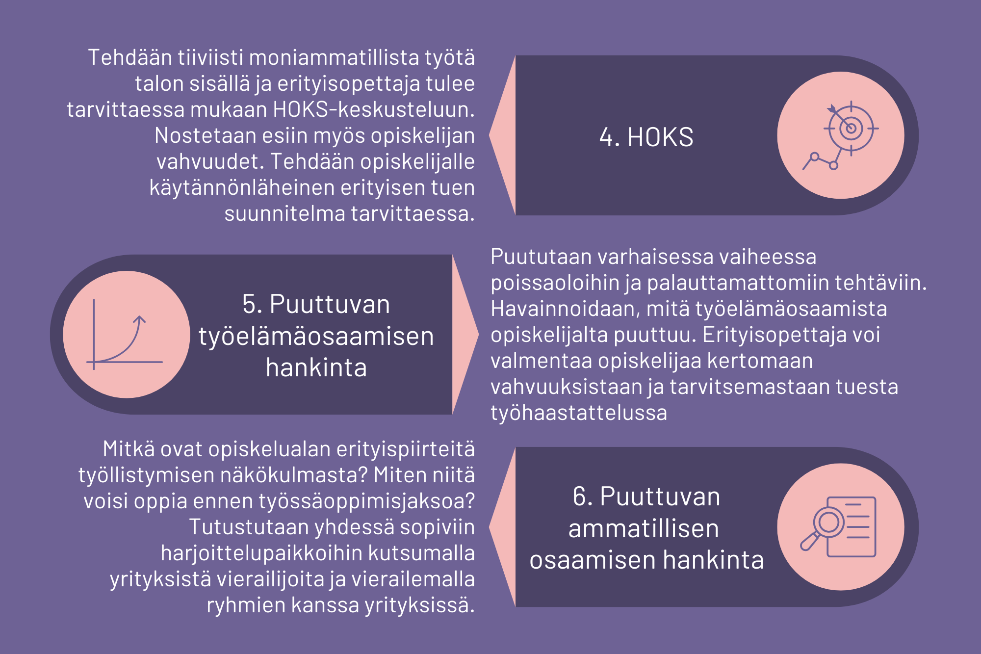 Opintojen alussa käydään opiskelijan kanssa HOKS-keskustelu, jossa tehdään henkilökohtaisen osaamisen kehittämisen suunnitelma. Se kirjataan ylös ja allekirjoitetaan. Opintojen edetessä HOKSia päivitetään tarpeen mukaan, kun suunnitelmat tarkentuvat tai muuttuvat. Jos opiskelijalla on tarvetta erityiseen tukeen, on erityisopettajan hyvä olla HOKSin teossa mukana. HOKSin lisäksi erityisen tuen antamisesta tehdään kirjallinen suunnitelma, jossa jokaisella on oma roolinsa. Työllistymisestä puhutaan tässäkin vaiheessa ja pohditaan opiskelijan kanssa hänen mahdollisia polkujaan työelämässä.