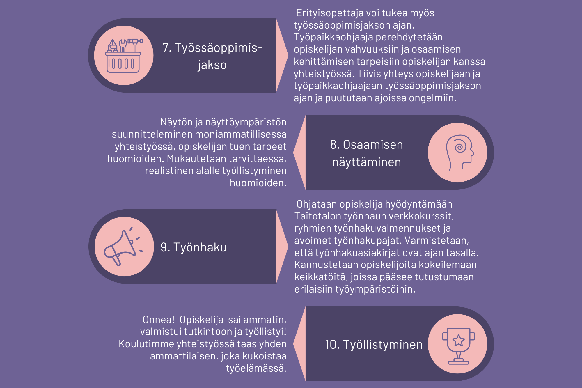 - Tässä ensimmäisessä blogissa esitellään opiskelijan polku työelämään kymmenen askeleen kautta. Infograafi jäsentää tuen vaiheita hakeutumisesta työllistymiseen ja tuo esiin, miten moniammatillinen yhteistyö kulkee mukana koko matkan ajan.