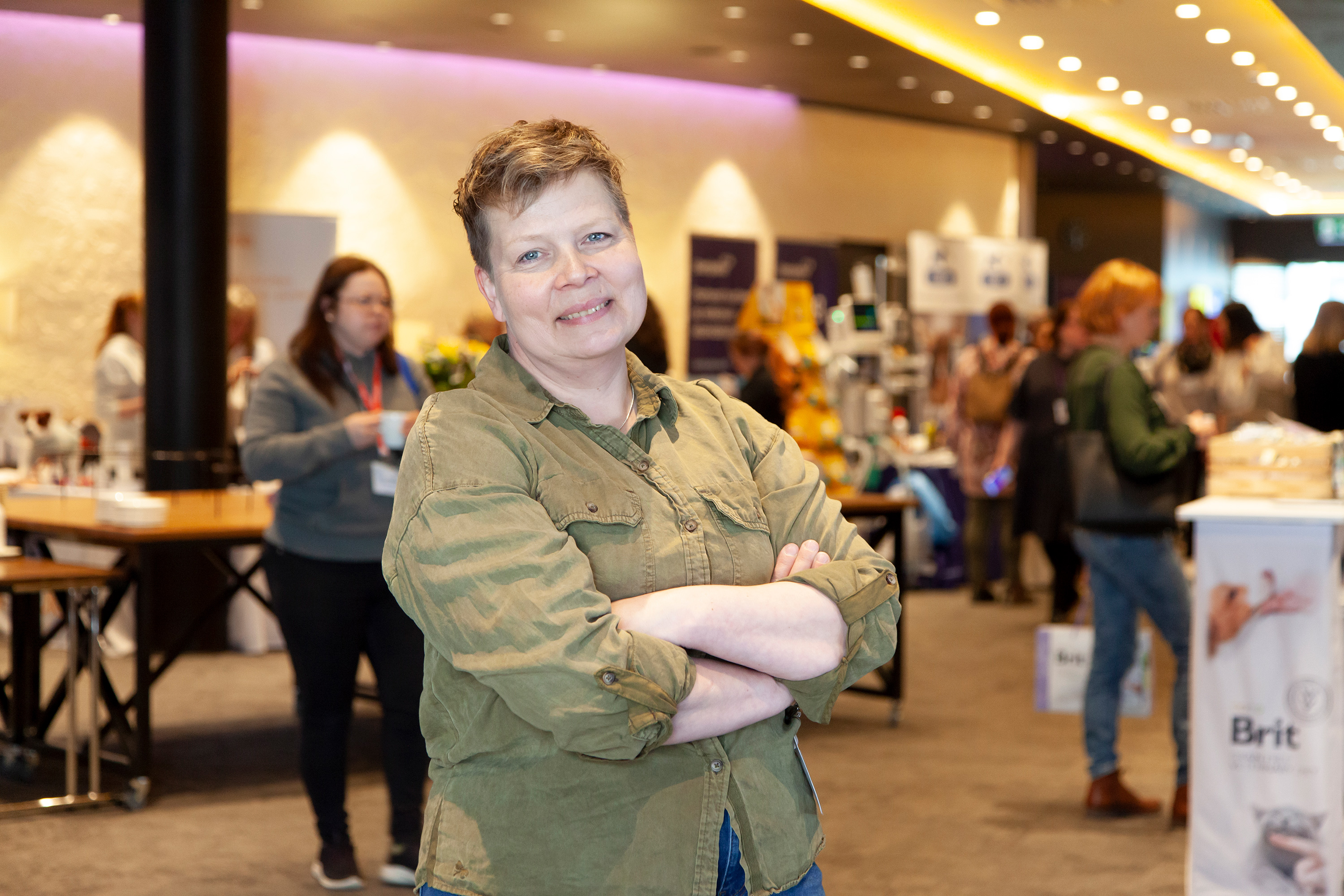 Yläkuvassa Jaana Auvinen (vasemmalla) ja klinikkaeläinhoitaja Niina Hyppänen Eläintenhoitajapäivillä Taitotalon kongressikeskuksessa keväällä 2025. He nappasivat kuvaan mukaan hopeiset foliopallot, jotka juhlistivat eläintenhoitajapäivien 20-vuotisjuhlavuotta.